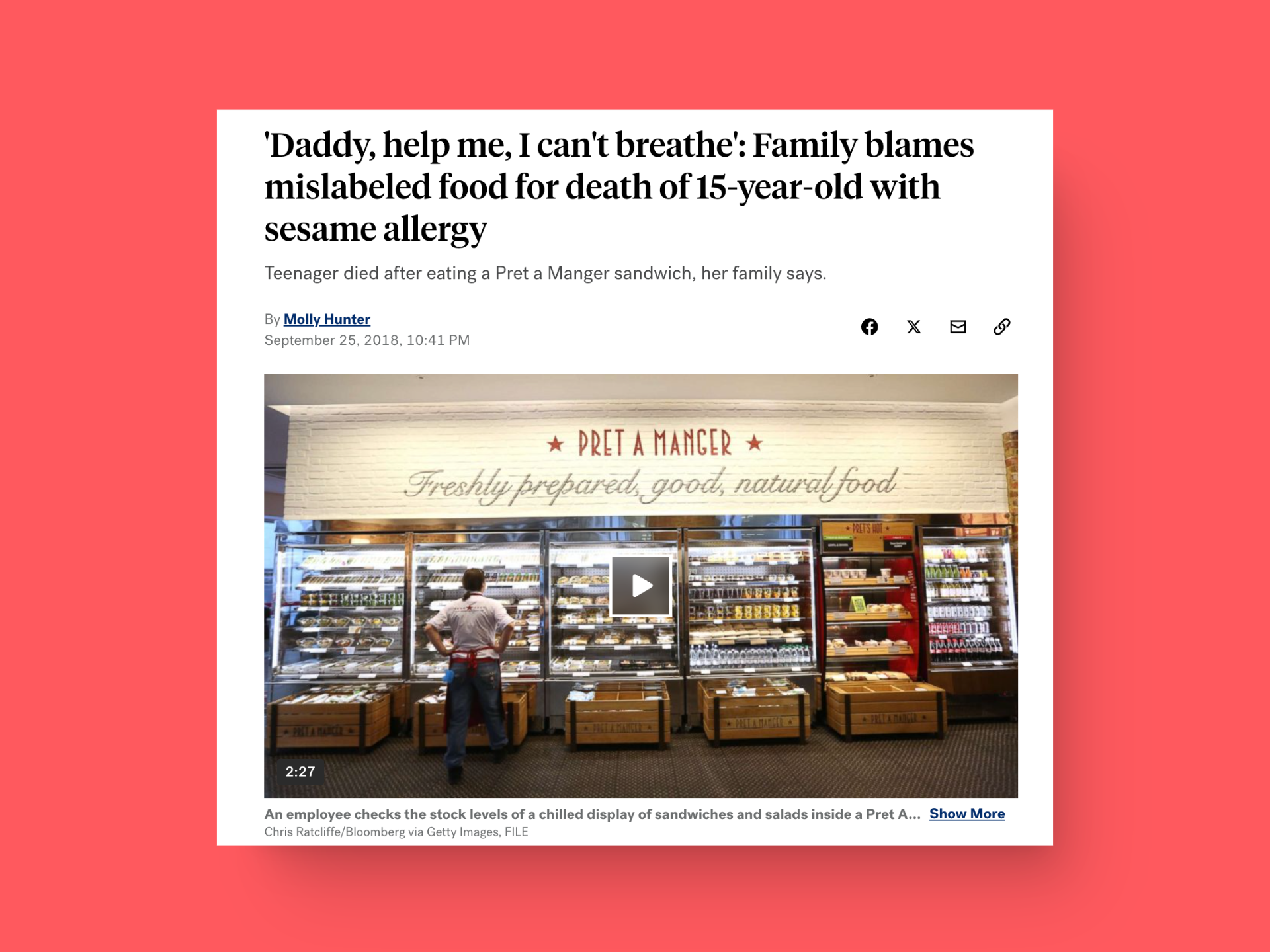 In 2016, 15-year-old Natasha Ednan-Laperouse suffered a fatal allergic reaction after eating Pret A Manager's sandwich. 20 minutes after eating the sandwich, she broke out in hives "like a jellyfish sting."