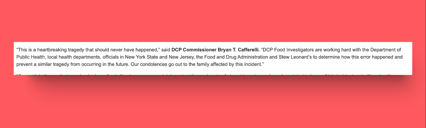 Regulatory scrutiny & recall notice: The Connecticut Department of Consumer Protection and other health officials also saw this tragedy. Following the investigation, they also sent a product recall notice to Stew Leonard.
