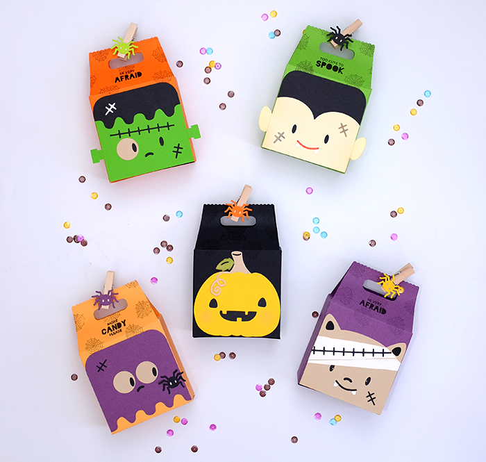 This one's more cute and playful. These Halloween treat boxes are die cut from Favor Bag into boxes and decorated with Halloween characters.