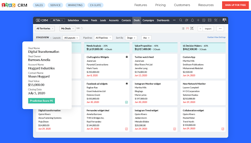 Zoho CRM lets you automate sales, predict sales, manage sales, and communicate with customers through multiple channels.