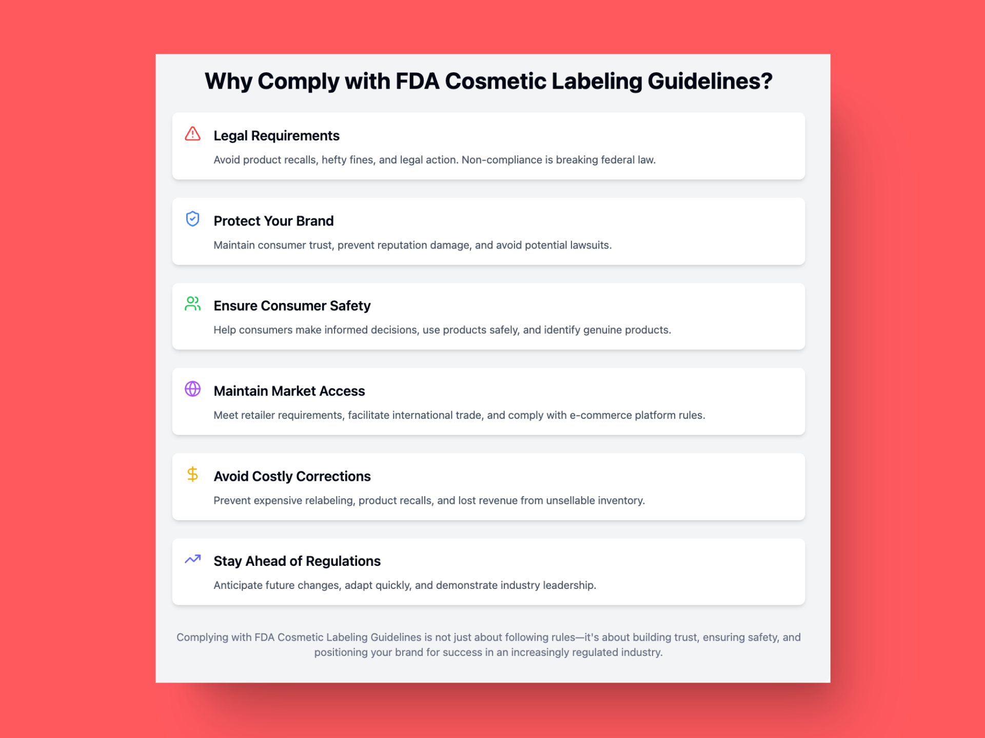 Complying with FDA Cosmetic Labeling Guidelines isn't just a good practice – it's a legal requirement with far-reaching implications. Let's dive deeper into why compliance is must: