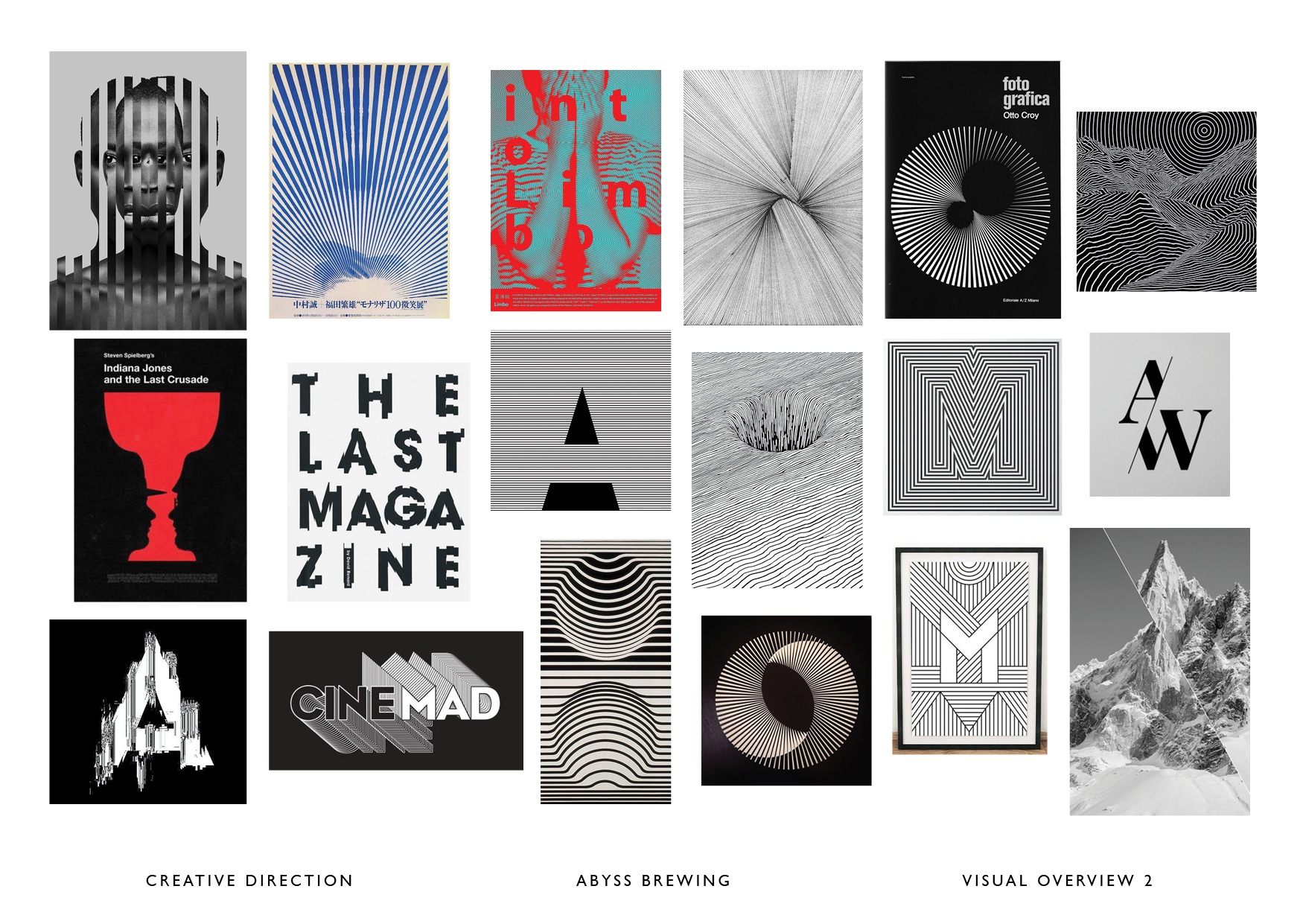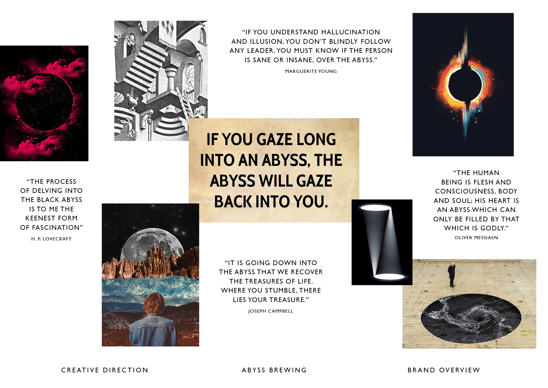 Working with the Friedrich Nietzsche quote ‘If you gaze into the ABYSS, the ABYSS will gaze back into you’ - the challenge was to develop an aesthetic that conveyed a positive version of an ABYSS; a kaleidoscopic world where the consumer could discover their own ABYSS through a range of modern beers.