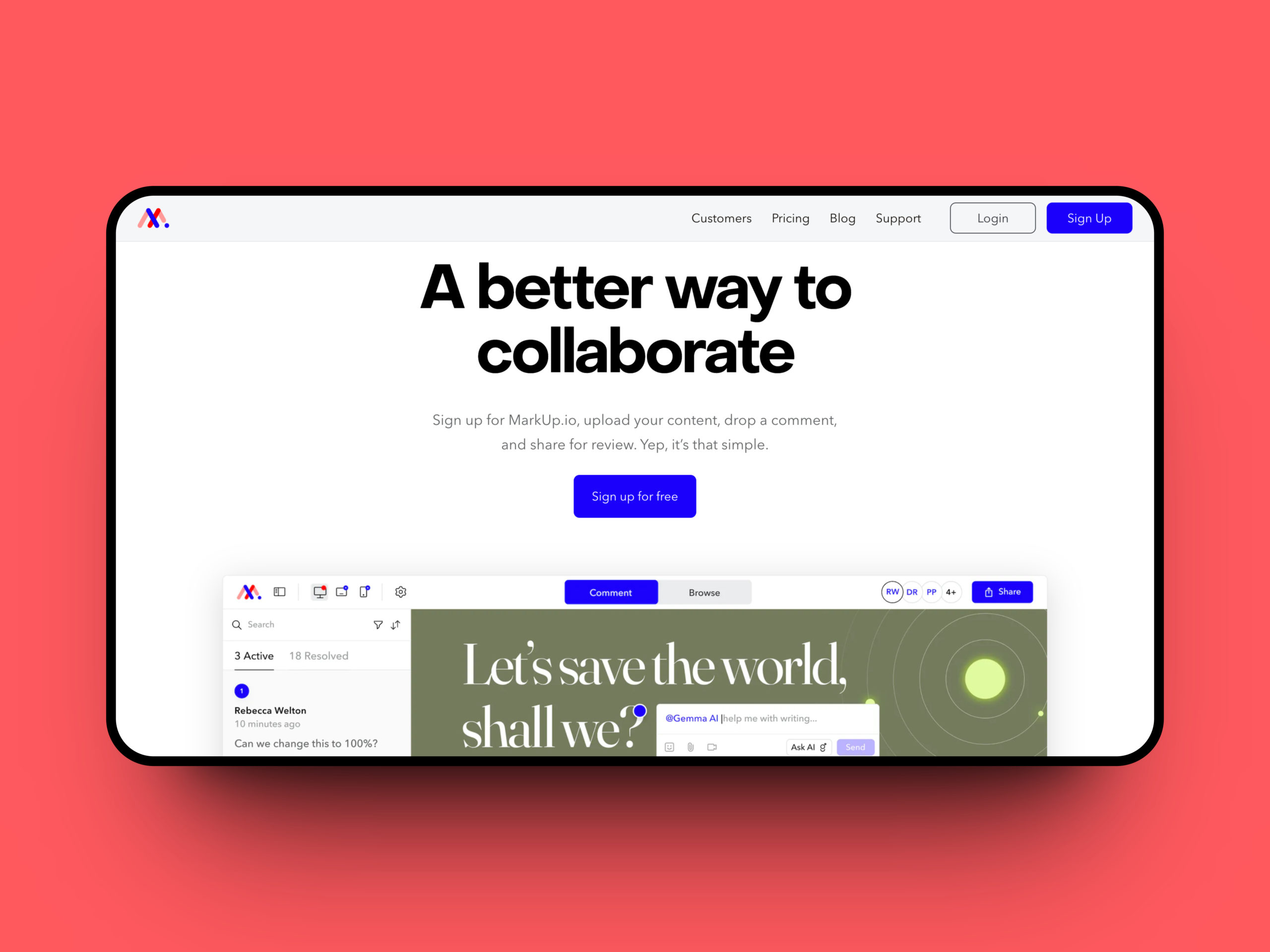 Markup.io is a collaborative visual commenting platform that claims to reduce review loops by 80% and yield the best work.