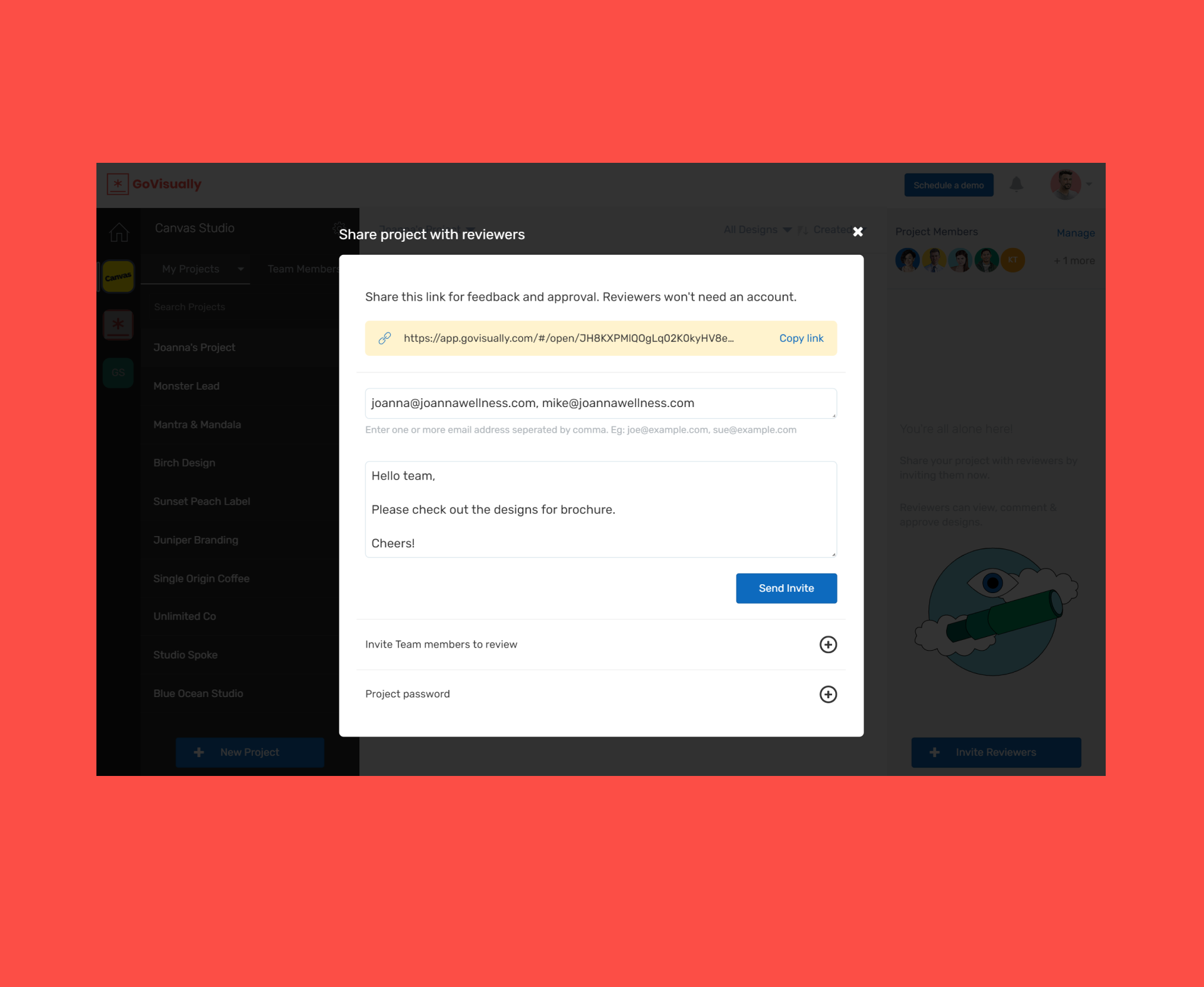 I can easily upload all designs to one project without worrying about file size. I can then invite desired reviewers to the project in one go too. It's cool that the system even used my team name and logo in the automated email.